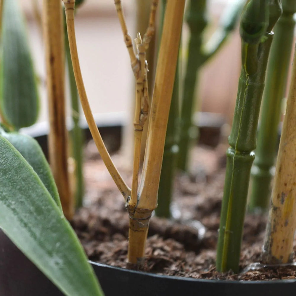 Om deze kunst bamboe perfect na te bootsen van Japanse bamboe, worden echte bamboestokjes gebruikt. Deze lichtbeige bamboestokjes worden losjes in de kunst bamboe gestoken, waardoor het er heel natuurlijk uitziet, net als de levende bamboeplanten in de natuur.