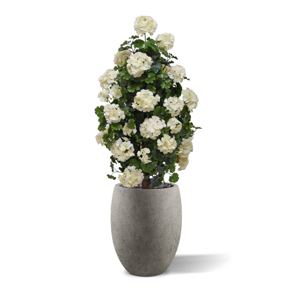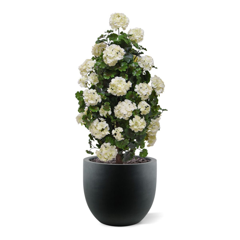 Deze geranium kunstplant is piramidevormig met prachtige crème witte kunstbloemen aan de stelen. De stelen zijn bevestigd aan de houten steel. De geranium kunstplant wordt geleverd met een zwarte pot (zie foto).
