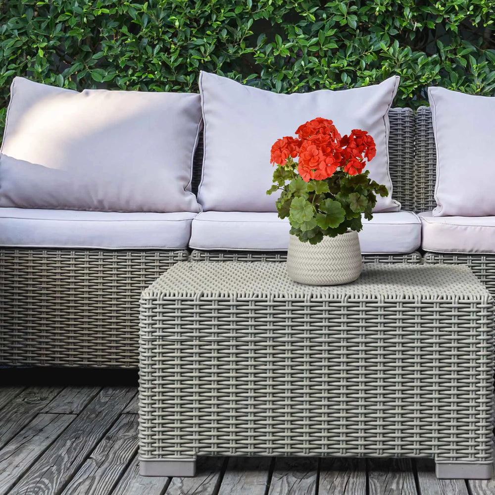 Geranium kunstplant met 6 rode kunstbloemen. De variërende grootte van de rode bloemen geeft de geranium een extra authentieke uitstraling. Gemaakt van stevig kunststof is deze prachtige rode geranium de ideale kunstplant om je balkon op te fleuren. En het allerbelangrijkste: deze kunstgeranium is een blijvertje. Wij garanderen, door middel van uitgebreide laboratoriumtests, een minimale kleurgarantie van 8 jaar!