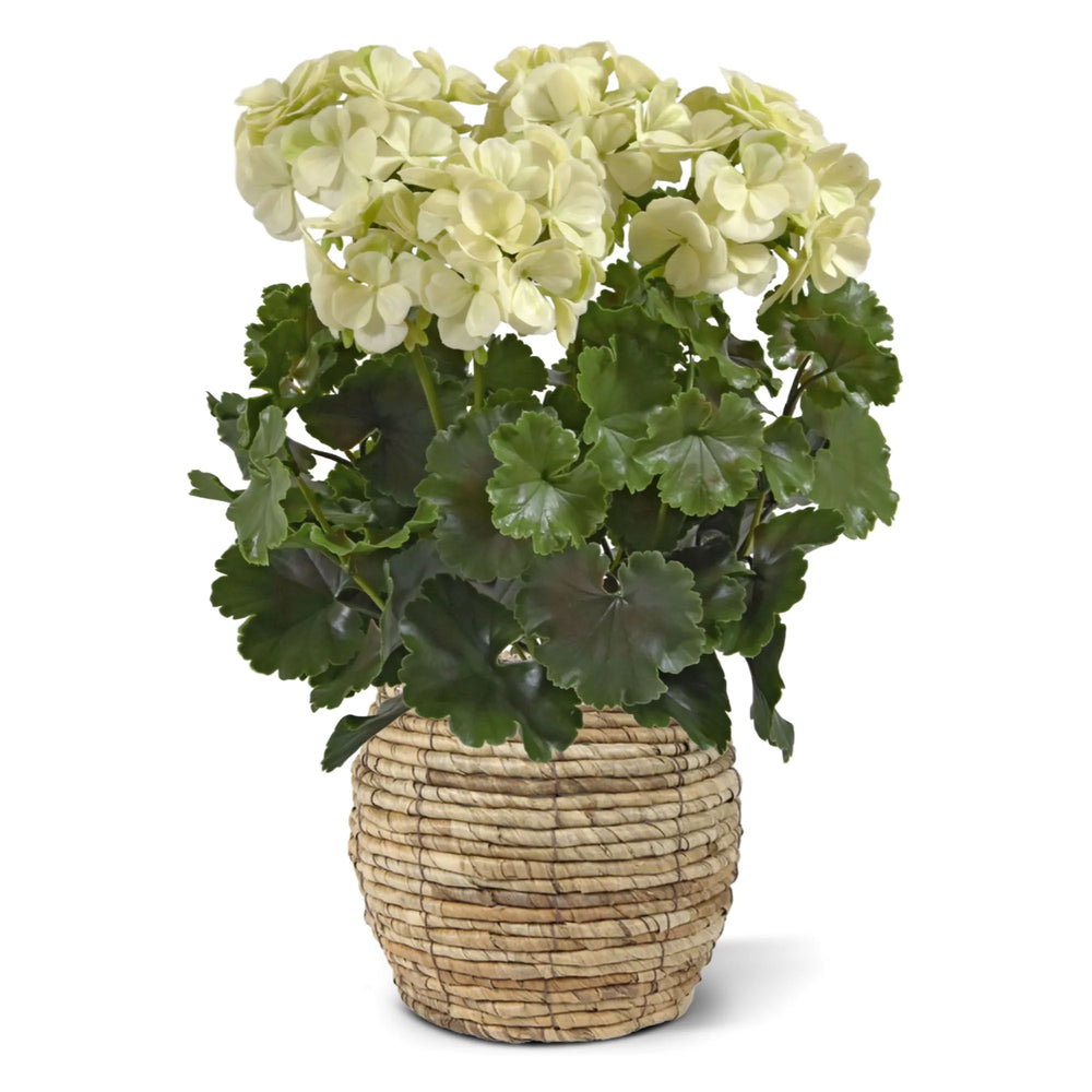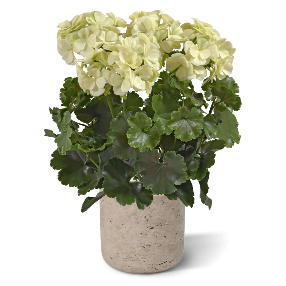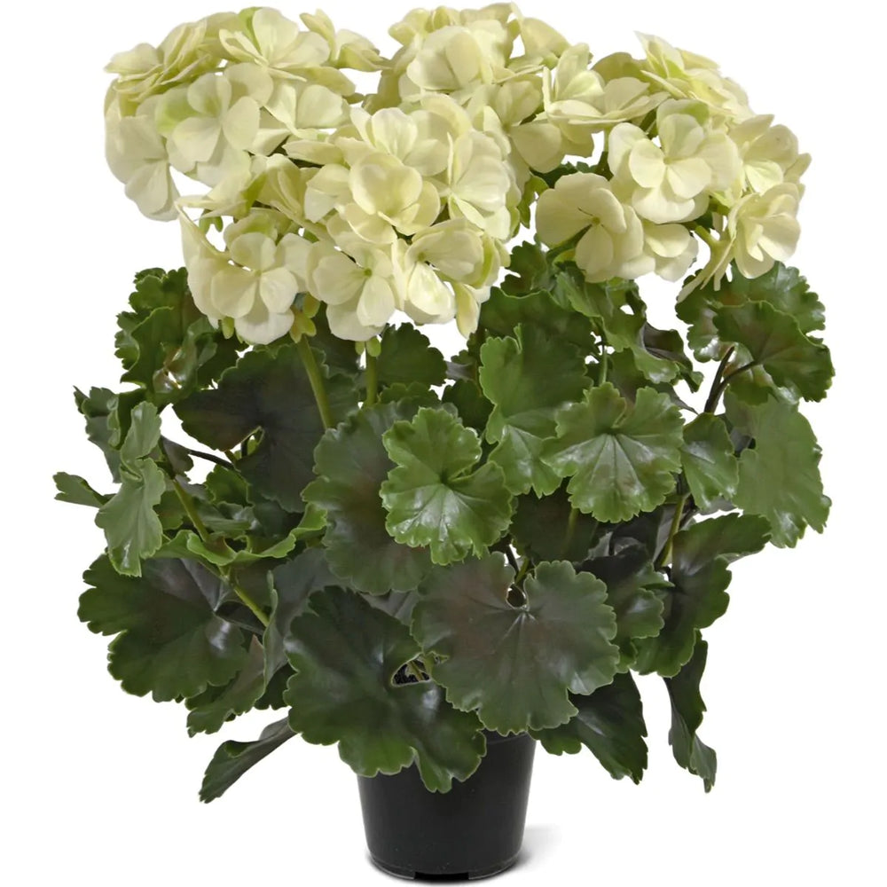 Deze altijd bloeiende kunst geranium is groter dan de normale kunst geraniums in het assortiment van Verdeflora. Deze grote kunst geranium XL heeft maar liefst 6 wit-crèmekleurige kunstbloemen in plaats van de 4 van de normale geranium.