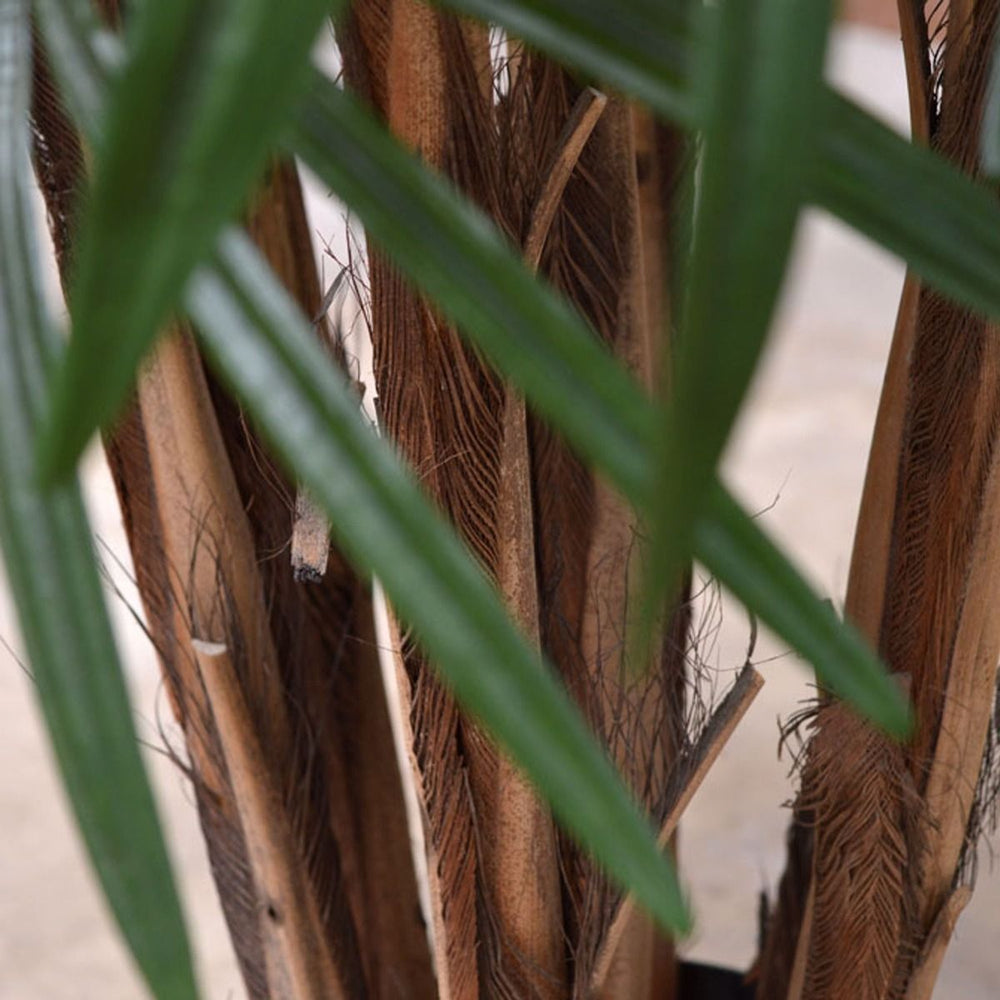De kunstpalm is 130 cm hoog en heeft een breedte van wel 95 cm. De 7 stammen vormen de basis om de palm in een hoge of lage pot te zetten, al zal niet elke sierpot geschikt zijn. Vraag ons gerust om advies.